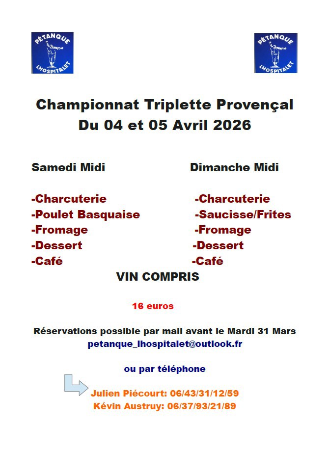 La championnat Triplette JEU PROVENCAL se jouera les 4 et 5 avril 2026 à Lhospitalet.
