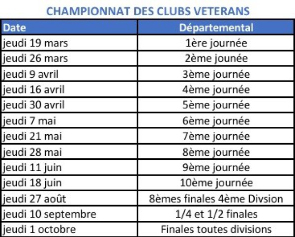 22/02 Calendrier des rencontres CDC Vétérans 1ère 2ème 3ème 4ème