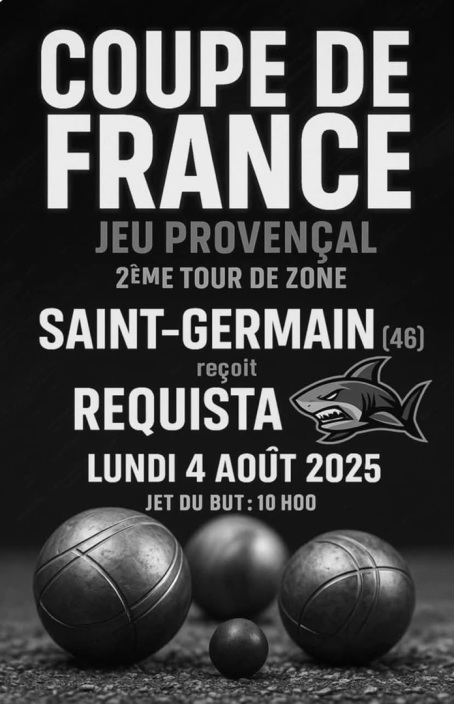 Victoire de Saint Germain du Bel Air contre Réquista (12) lors du 2ème tour de zone Coupe de France Jeu Provençal 2025 (16 à 3) : 2 doublettes et 2 triplettes gagnées.