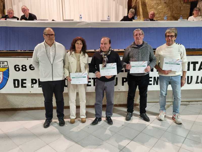 6 médailles de bronze ont été décernées à : Sylvie Austruit, Présidente de la Pétanque Figeacoise, Kevin Austruy, Trésorier du club de Lhospitalet, Daniel Durand, Vice-Président du club de Cahors Sport Pétanque, Isabelle Greffier, Présidente du club d’Arcambal, Louis Molesin, Président du club de Vers, Gérard Ruscassie, Président du club de St Céré.